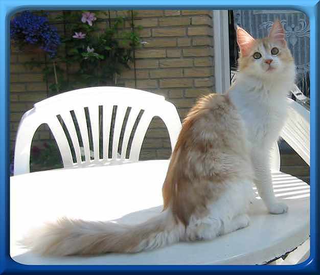 Findus von Morija born 04-08-2001. He has a very beautiful light red smoke + white colour with a great part of white pattern. His coat is nealry perfect and without any undercoat. Findus a a realy great boy but very slender and he has high legs. Thanks a lot to Raphael Pott for this lively boy!