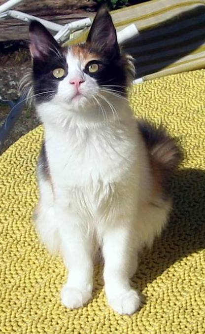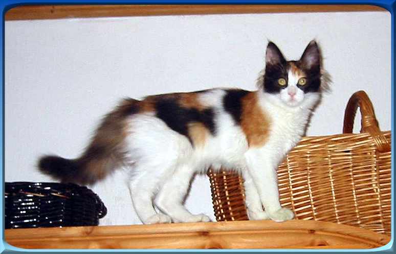 Mi-Amor ist ein wunderschönes Mädchen, und die erste junge Dame in meiner Cattery in der Farbe "calico" von der ich schon so lange träume! Sie hat einen wunderschönen buschigen und langen Schwanz und ist eine sehr liebe Katze. Unsere erste Ausstellung wird die CFA Ausstellung 10/2004 in Köln sein und ich freue mich schon darauf, die junge Damen zu zeigen!