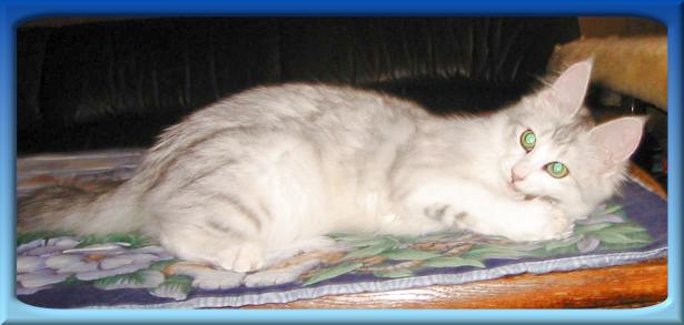 | Hosca kal Peppermint Patty is a realy lovely and typeful young lady with the extraordinary colour silver shaded. A very great thank-you to Ute Kunze who has aready great success with breading Turkish Angora Cats in this colour silver shaded. |